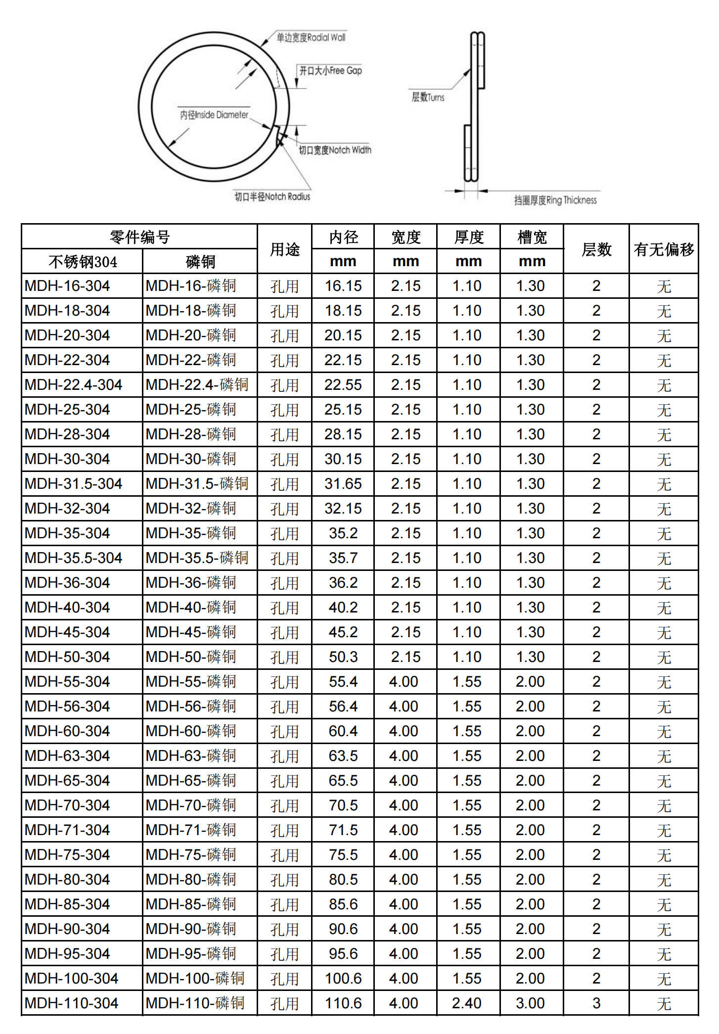 | 零件號(hào) | 用途 | 內(nèi)徑(mm) | 寬度(mm) | 厚度(mm) | 槽寬(mm) | 圈數(shù) | 有無偏移 |